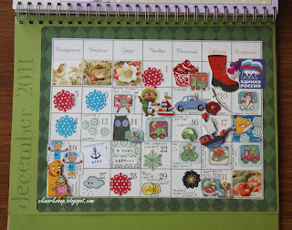 Календарь почти на 100% сделан из "вторичных" матералов - старого настенного календаря, обрезков цветной и скрап-бумаги, оберточной бумаги, меню, коробки от шоколадного адвент-календаря, наклеек. Когда нужно было что-нибудь специфическое (вроде angry birds) я распечатывала картинки на принтере.